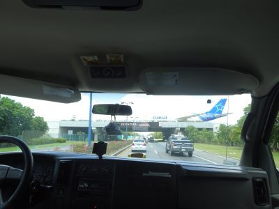 タクシーに乗り、空港に向かいます。空港近くで、道路の上を滑走路に向かう飛行機が右から左に動いて